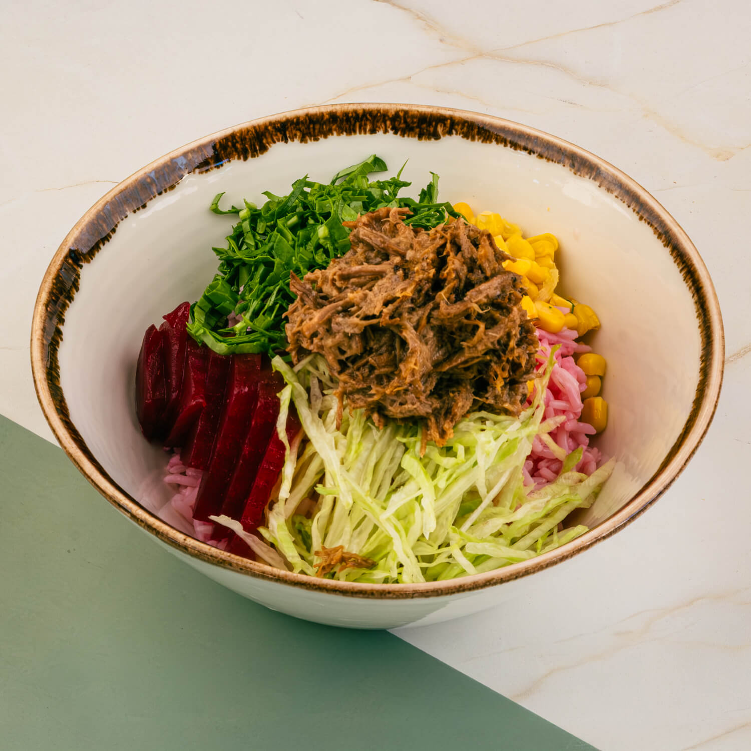 Dana tiftik, pancarlı basmati, roka, iceberg, pancar turşusu, mısır ile servis edilir.